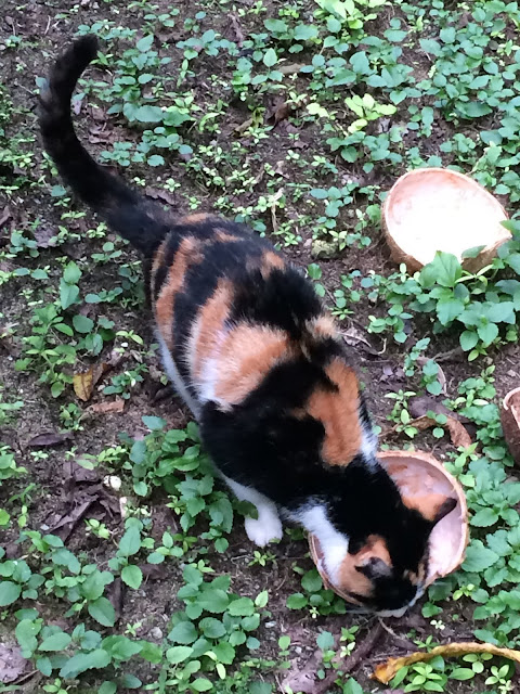 After drinking we used the tender flesh, you can just eat it as it is, or use it in cooking (the best was to pan-fry it with olive oil and smoked salt and eat it as 'vegan bacon'. Then we gave the shells to the cat and it cleaned it up! Never seen a cat eating coconut!