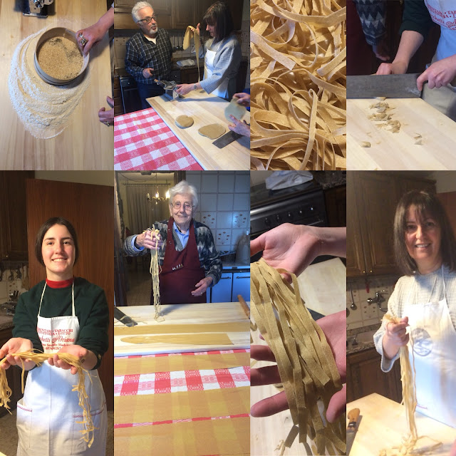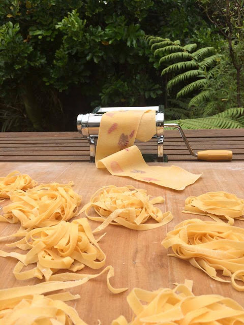Mix the flour with the eggs to make a smooth and elastic dough. Divide into 6 pieces and pass them through the pasta machine, in turn, going from the largest setting to the second thinnest (or thinnest, depending on how thin you like your pasta). Then pass through the taglioni setting and create some nests. Set aside.