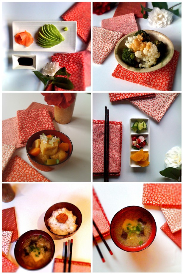 | From top left: avocado sashimi, broccoli and cauliflower with miso sauce, fried tofu puff simmered in vegetable broth with carrot, celery and onion weed, 'almost' homemade Japanese pickles, eggplant and dried tofu miso soup and rice with umeboshi to finish. |