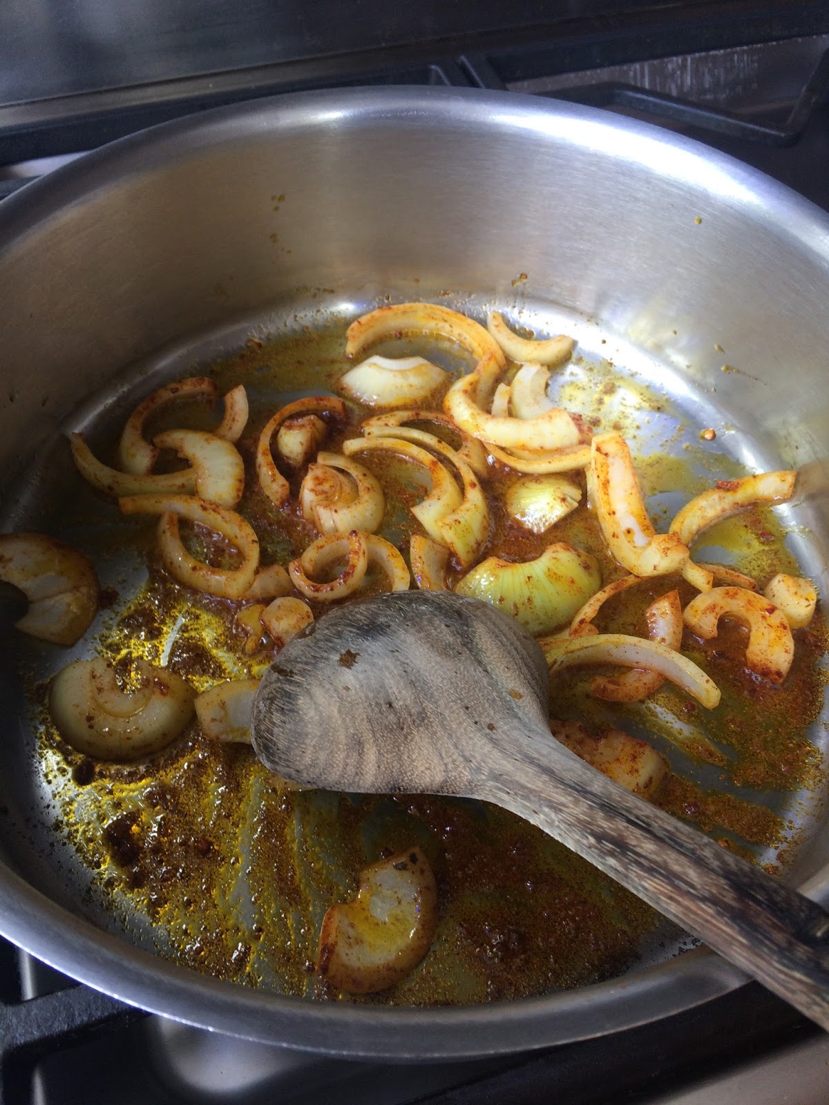 First I fried some onion with olive oil and a Tio Pablo Mexican spices, in the meantime I drained the jackfruit and cut it into smaller segments, like in the photos.