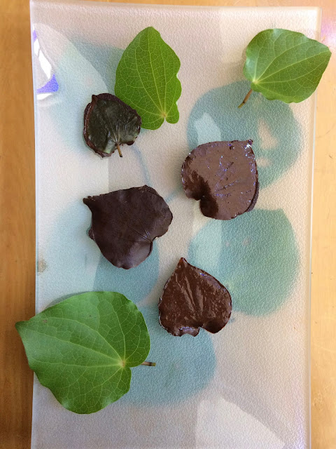 But these chocolates are my best creation to date, or so I think - so if you copy them please credit me ;-) (I had far too many recipes from this and my other blogs taken without credits, a bit cheeky really, especially if Kiwis do it: New Zealand is a small place, too small to do this!!).Melt a block of dark chocolate in a deep plate or terrine (not in a bowl - you want something with more surface than deepness) over a pot of hot water. Forage your kawakawa leaves, wash them well and pat them dry. Holding the stem place them shiny side down onto the chocolate, and then on a tray lined with cooking paper, chocolate side facing up. Add a little chocolate with a teaspoon if you missed a bit - you want to cover the whole surface of the leaf. Don't make it too thick though, thin after-dinner chocolates are more 'rstylish'.