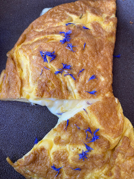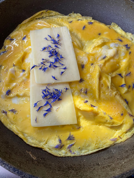 For the frittata: beat three free-range eggs with a little water and a pinch of salt. Grease a fryingpan with olive oil and when the oil is hot add the eggs. Spread the mixture well (I make four 'cuts' on the sides to spread the eggs well) and sprinkle with cornflower petals.
