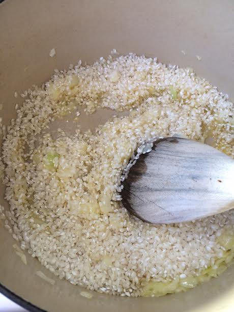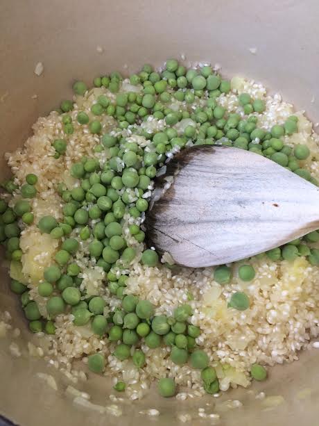 To prepare the risotto chop an onion and saute with butter, plenty of butter! Butter should still be bubbling when you add the rice (I used arborio). Stir until the rice is hot then add the peas.