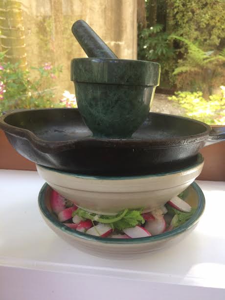 Put another bowl over the radishes and then a weight on top (a rock, or anything heavy that you may have in the kitchen). Leave for a day and night, move the radishes from time to time if you like, to get them pressed. They will put out lots of water and create a brine.
