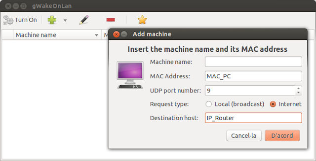 Només ens queda reiniciar l'encaminador i ja podrem engegar el nostre servidor des d'internet. Des d'una màquina Ubuntu ho podem fer amb l'aplicació gwakeonlan, indicant la MAC del servidor a engegar i la IP externa del nostre encaminador, tal com es veu a la imatge de sota: