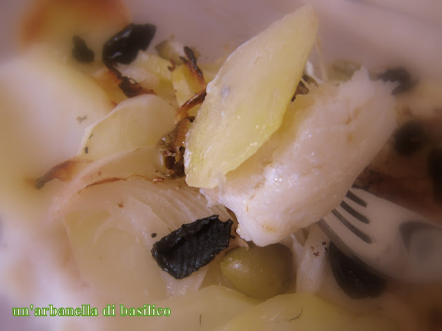 NASELLO AL FORNO CON CIPOLLE E PATATE