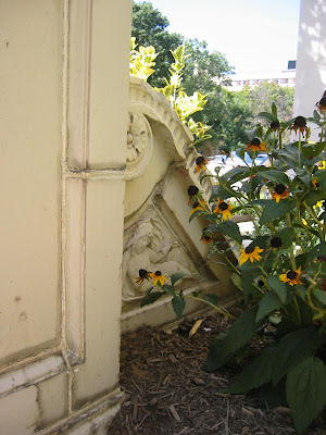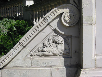 I love the figures on the scrolls at the bottom of the drive.Even the backside of the scrolls have this beautiful detailing -only the black eyed susans get to enjoy these though! Lets go inside.The building has been renovated many times but still has really great porportions and beautiful light due to the huge windows. Above is the rather utilitarian entrance which brings you to the grand stair.The home has a piano nobile design (the main floor is what we Americans would call the 2nd story) , a typical Italian renaissance feature; all the better to enjoy views of the park. At the top of the stair is a more grand foyer with entry to the portico's balcony.To the left is a room now used as the dining room. These main public rooms still feature the original fireplaces and mouldings and have huge french doors looking over the park. Behind those doors flanking the fireplace is a corner study which is practically a conservatory because of the amount of glass.Here you see through the foyer into the ballroom from the dining room.