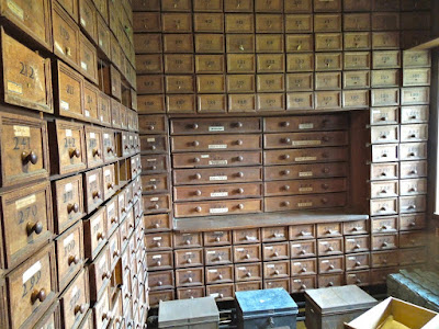 The muniment room is lined with drawers, each one labeled with a Cavendish property.