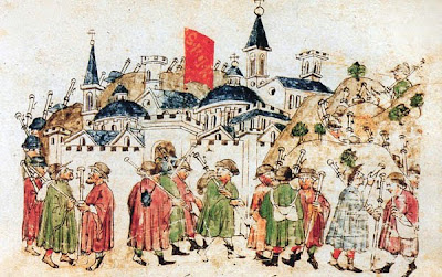 Pope Boniface VIII, much more economically stingy than Jehovah but spiritually much more indulgent, proclaimed the first Christian Jubilee on the 22nd of February in the year 1300. In return for 15 days of visits to the basilicas of St. Peter and St. Paul for pilgrims and 30 days for native Romans, the penitent faithful (above) received complete absolution of sin.