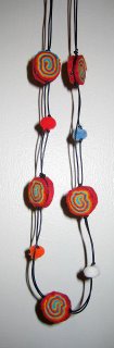 Lá experimentei fazer os rolinhos de feltro coloridos para colocar num fio de couro. Acho que ficou engraçado...