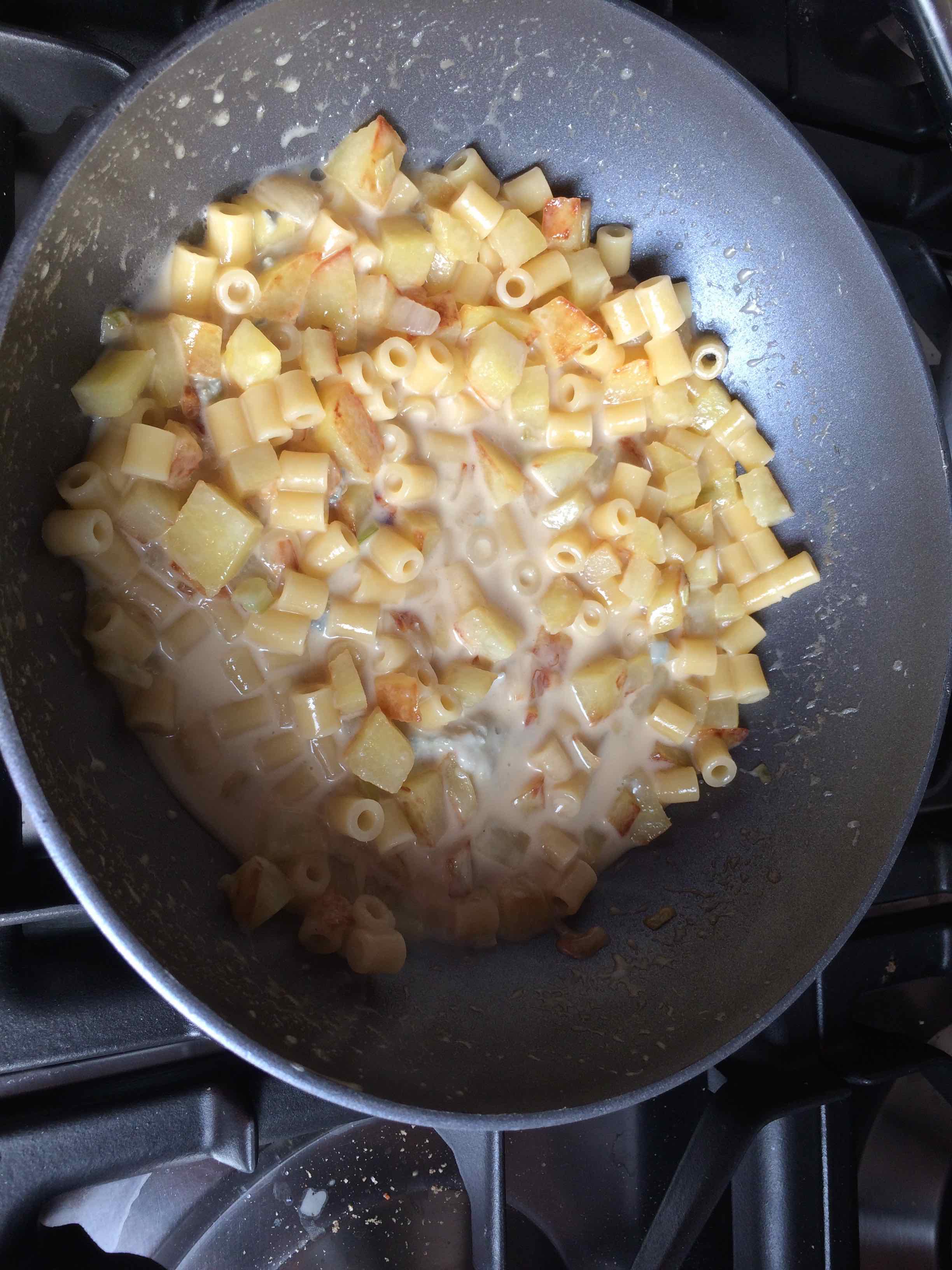 Ingredienti (per 2): 150 gr di Gorgonzola, 60 gr di tubetti, una patata, una costa di sedano, una carota, una cipolla grossa, pepe in grani, 4 semi di ginepro, 2 chiodi di garofano, olio, burro, sale .