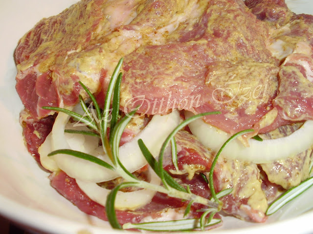 - Egy kisebb edénybe lerakjuk a hússzeleteket úgy, hogy közéjük vastagabbra karikázott vöröshagymát és rozmaring ágacskákat rétegezünk.