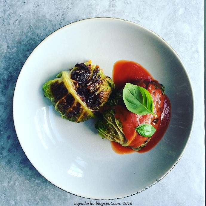 Podajemy golabki na goraco, z odrobina passaty, listkiem bazylii I plasterkami mozarelli.