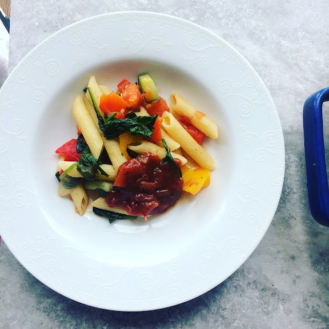 Na rozgrzana patelnie wrzucamy maslo, nastepnie umyte i pokrojone warzywa: papryke, cebulke. Doprowadzamy do zeszklenia. Po czym wrzucamy pokrojona cukinie i pomidory. Warzywa dusimy okolo 10 minut az puszcza sok. Sok odlewamy. Ugotowany makaron laczymy z warzywami, doprawiamy sola i pieprzem do smaku. Podajemy na goraco z odrobina salsy i potartym serem parmezan.