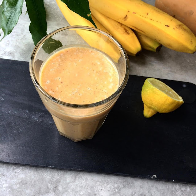 Powstal  nieco z przypadku, bo nie wiedzialam co mam zrobic z czescia pieczonej dyni. Polaczylam ja wiec z bananami, jogurtem i maslem migdalowym, ktore ostatnio na dobre zagoscilo w mojej kuchni. Dynia jest prawie niewyczuwalna, koktajl nie jest zbyt gesty, raczej slodki, a w smaku - rewelacyjny  - polecam!