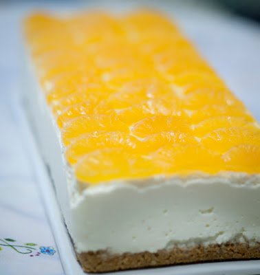 | Mojamos un disco de bizcocho con almíbar, le ponemos una capa de mermelada, otra de cobertura de mandarina... y vuelta a empezar ! |