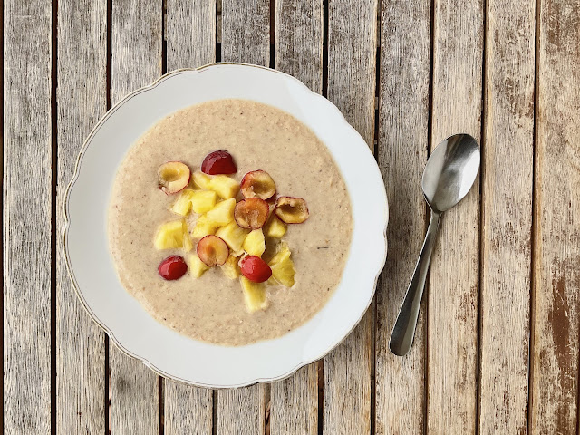 Korrekt müsste die Bowl eigentlich „Fermented Emmer Wheat“ heißen. Denn statt Haferflocken habe ich diesmal Emmerflocken verwendet. Außerdem sind noch Ananas und Kirschpflaumen mit im Mixer gelandet.