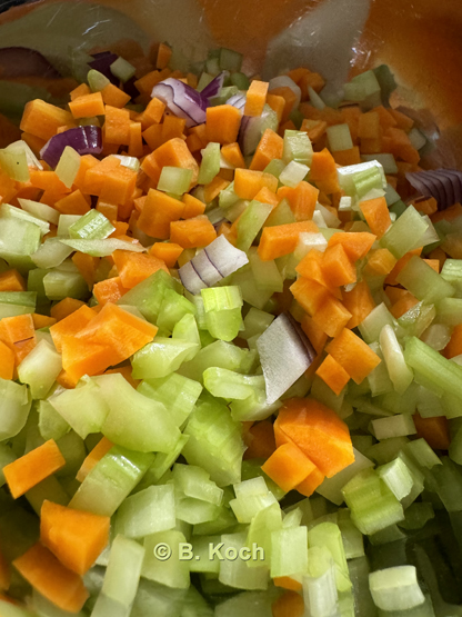 Zwiebel, Möhre und Sellerie in feine Würfel schneiden.