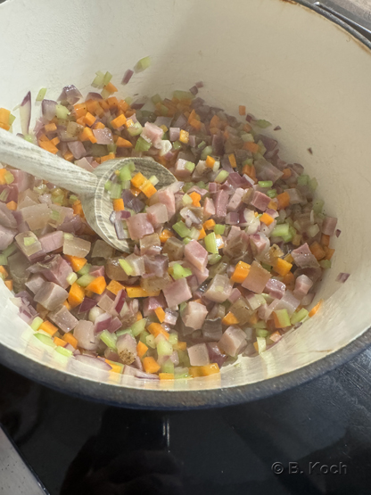 Olivenöl auf mittlerer Temperatur in einer Casserole erwärmen, das gewürfelte Gemüse (Sofrito oder Mirepoix) zugeben und langsam unter Rühren glasig anschwitzen.