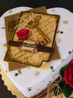 Тази торта също е инспирирана от картичка, която получих от Дани Пиркова - една от прекрасните ми булки, за които съм ви споменавала и друг път, но все още не съм ви запознала с нея лично. Тя живее в Пловдив и хобито й е да изработва изключително стилни, оригинални и красиви картички и разни други неща от хартия. Това е нейният блог, където може да разгледате красотите, които твори. Конкретно тази картичка ми изпрати в знак на благодарност за сватбената торта, която им направих. Влюбих се в нея и се зарекох някой ден да я претворя от захарно тесто. Ето, че съвсем скоро ми се отдаде такава възможност. Мими, една приятелка от квартала, ми поръча торта във формата на сърце, с която да изненада съпруга си Илиян по случай годишнината от сватбата им. Какъв по-подходящ повод да измайсторя захарната картичка?! Както и друг път съм ви споменавала, при подобен род задачи, когато се търси максимална прилика с оригинала, цветовете играят изключително важна роля. А в сладкарството да успееш да оцветиш захарното тесто в определен нюанс е доста по-трудно, отколкото в рисуването, да речем. Изобщо не бях сигурна дали ще мога да постигна особения цвят на пощенския плик, но чрез смесването на доста бои успях да го възпроизведа почти 1:1. Оттам насетне всичко беше лесно и изключително приятно и забавно. Постарах се да пресъздам всеки един детайл. За сравнение може да погледнете снимката - върху тортата е захарната картичка, а долу в ляво е оригиналната. Промених единствено текста. В моя вариант той гласи: "Ключът към дългия и щастлив семеен живот е в пълното доверие. То е в основата на истинската любов, разбирателство и приятелство."Имам и правописна грешка, за срам и резил, но късно я видях.