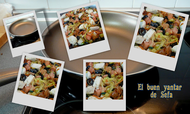 En la misma sartén volver a poner un poco de aove y a fuego medio, pocharemos las verduras de una en una empezando por, zanahoria, puerros, tomates, calabacín y por ultimo las olivas cortadas en rodajas, salar y al final añadir la pechuga que tenemos reservada.