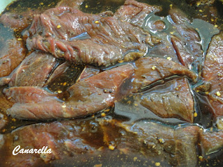 Cut beef in strips 1/2 inch wide,1/4 inch thick and 4 to 6 inches long.