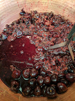 Start by putting your cherries and lemon juice in a large non-reactive pot. Stir on a medium heat while smashing your cherries to the consistency you like. I like nice pieces of fruit in my jam's. Keep stirring the cherries keeping the heat at bay so as to not burn or scorch your jam. Never ever ever make jam without having the time and patience to enjoy the process.
