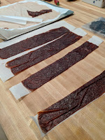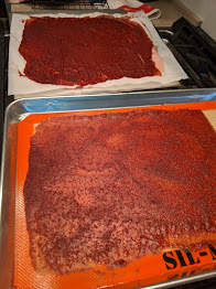 Now it time to turn on your oven and set it to 170 degrees if using an oven. Your dehydrator can be used depending on the type you will need special inserts for leather. Your oven you just need a cookie sheet with some parchment or a silicone pad. The nice thing I find is with the parchment paper you can cut and roll it right on that paper. Sweet !