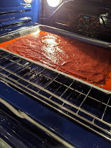 Spread the fruit mixture out either with a spatula or the back of a spoon. I just use a spoon then drop the tray on the counter slightly to rid it of bubbles ad even it out. Now it is time to put it into the oven/dehydrator. I can tell you the time is so variable. Oven takes 5 hours or so. The dehydrator depends on which kind you have. The thing you will look for is the fruit leather should no longer be wet but a tad bit tacky.