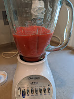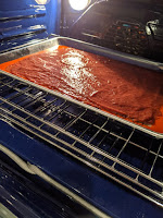 Enough of that you get it. Next pour your mixture into your blender or food processor. Whip it until it is super thin and the fruit is blended. Take your blended fruit and pour it onto the cookie sheet/trays making it approximately 1/8" thin. Give or take. Just go with the flow.