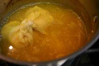 So thinly slice your lemons and one of the oranges , it comes to about a cup.Now take the slices and cut them into quarters. Put the slices, rinds 2 cups of water with the baking soda into the pot bring it to a boil . Turn it down and let it simmer on low for 20 minutes this tenderizes it. This also brings out a lot of the natural pectin from the peels.
