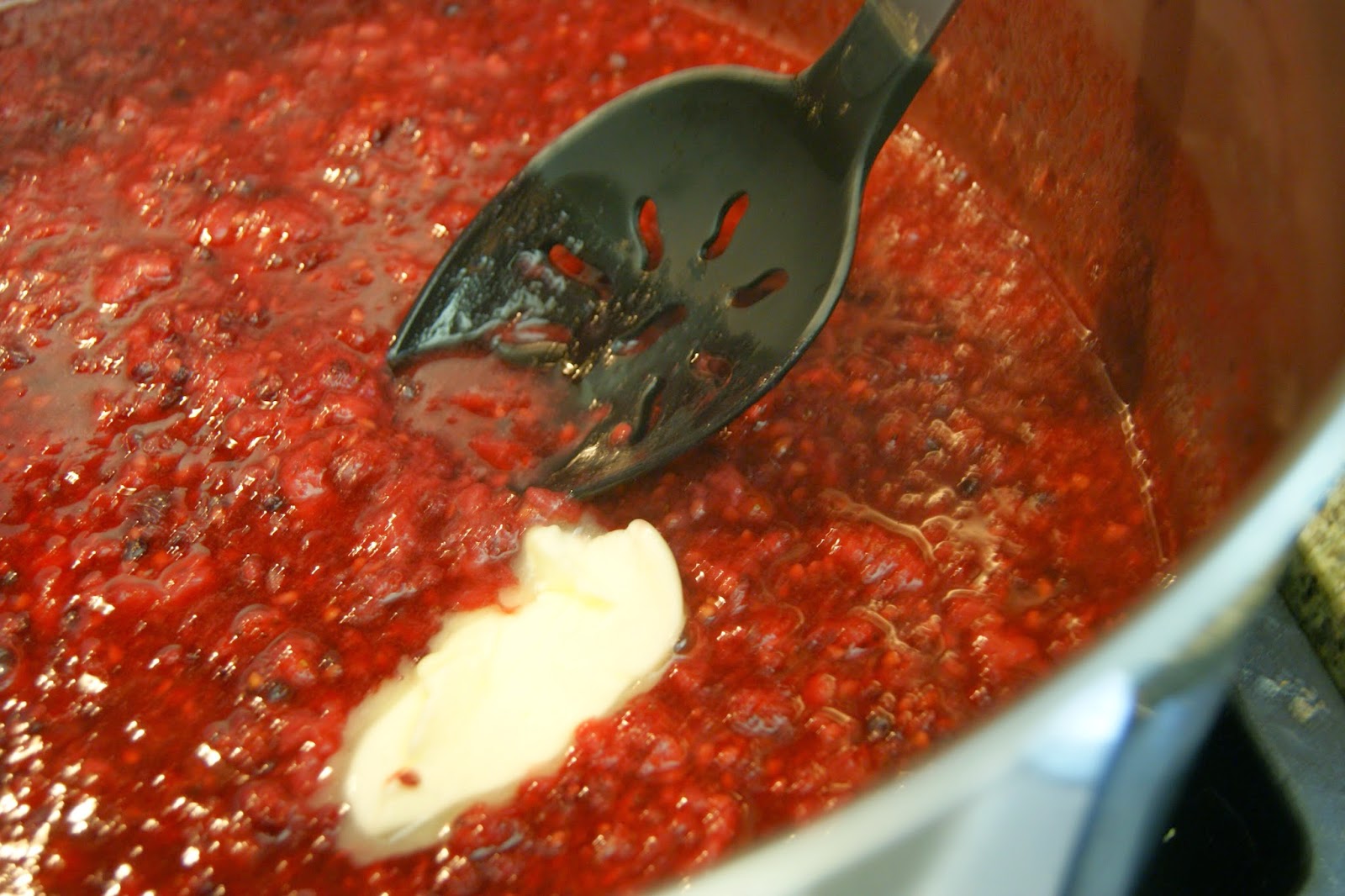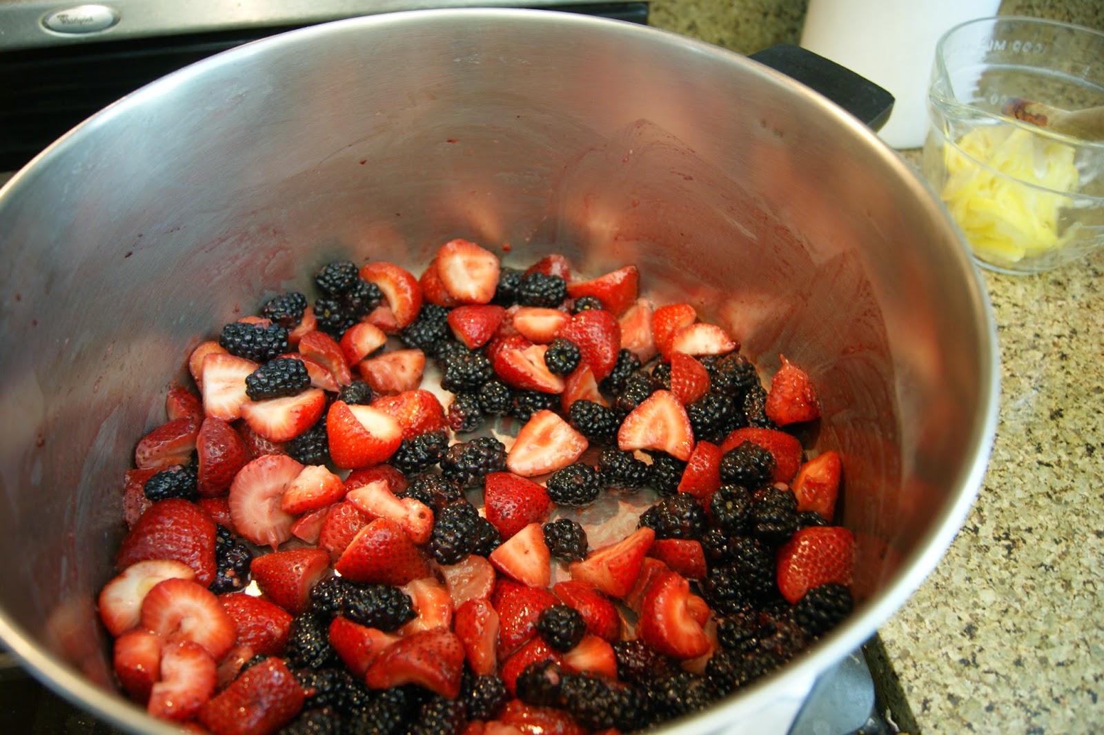Add all your berries to your Non-reactive pot. Bring up to a slow simmer. Your blackberries will start to soften up and separate. All the berries will start releasing their juices. keep stirring the jam. this is the time to mush your berries. I use a potato smasher to get the berries to the consistency I love.