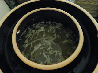 Notice my liquid does not cover the cabbage. I will add more liquid that I made this morning so it would be cool enough to add. * If the liquid is not at least 4 to 5 inches above the cabbage you will add