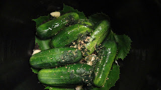 I had to wait to do this because most of the sites I explored said to use Grape Leaves to keep them crunchy during the fermentation process. I did find another site that said you can use Oak leaves. My friend has grapes a plenty and it is worth the wait.(The leaves supply the tannins which keep the pickles crisp)