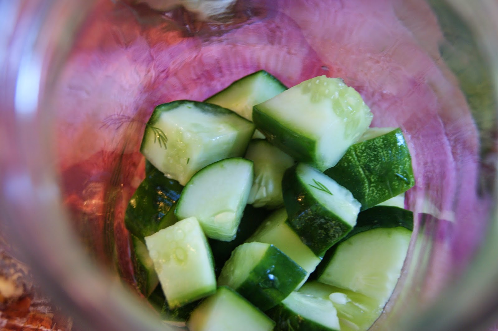 Pack your cucumber's chunks, garlic cloves and dill into the sterilizer jars, leaving a 1/4 inch of headspace.