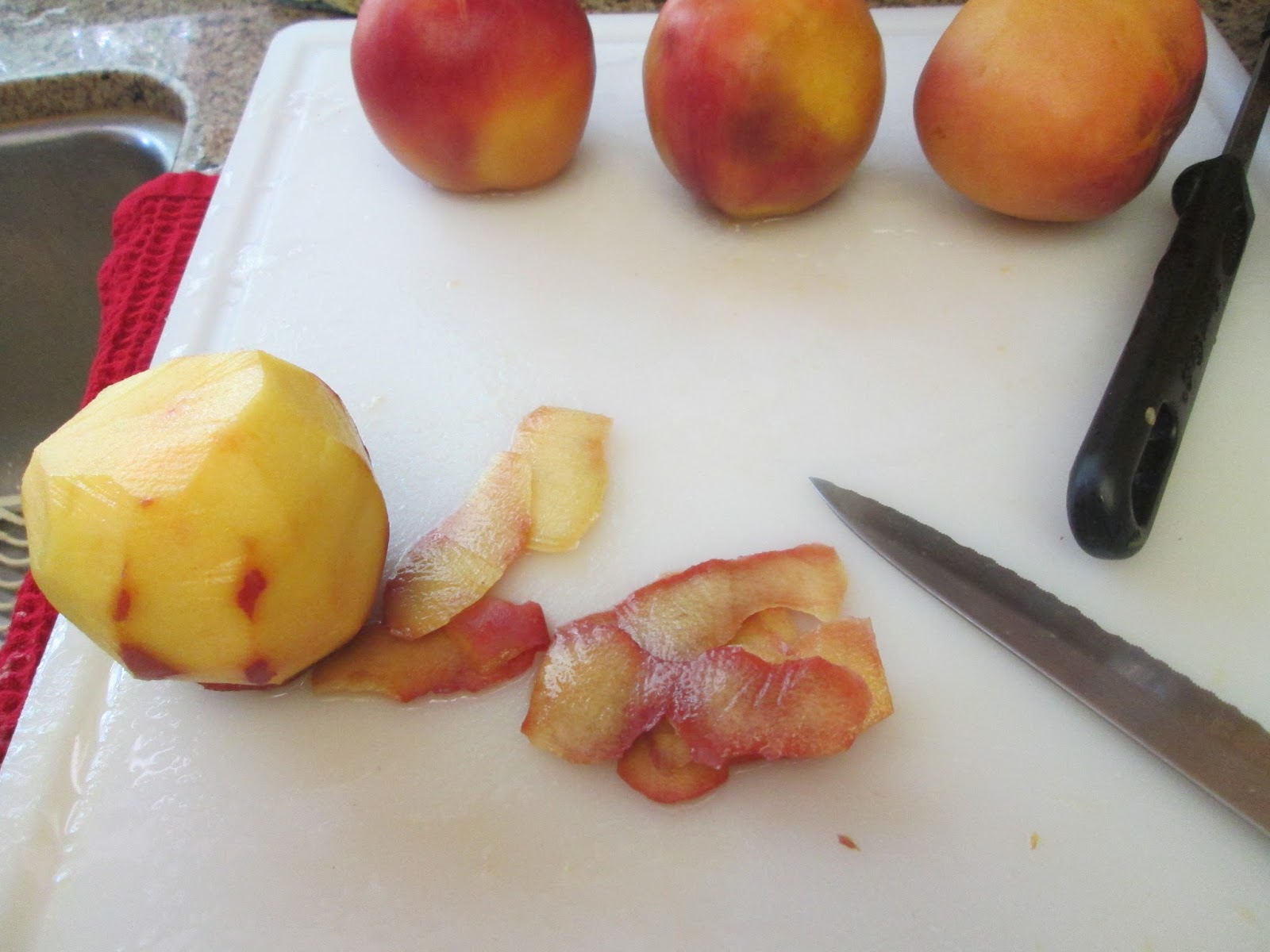 A few things I need to review with you is first the peeling. I read on all the sites to put them into boiling water for 30 seconds to 1 minutes. This is a good method BUT these peaches did not want to peel or let go of their pit. Little devils. They do say over ripe peach peel easier.I will research reasons for this in another post. All I did was use a sharp paring knife to peel them and then proceeded to chop them.