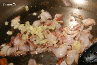 In an iron skillet (My Favorite) cook the bacon just until it is getting done. Add the chopped onion just as the onion's getting a nice color add the garlic and cook for a few more minute.