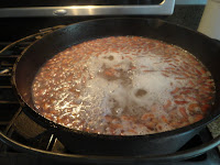 Take 8 cups of your soaking beans and put them into a large stock pot and simmer until you get a foam on top. I skim the foam like jam also take out any floating beans or shells.  Also look for icky ones and remove them. Once the beans have been simmered turn off the heat and set them aside.