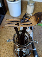 Alrighty enough let's start by removing the beans from the Vanilla Extract. This can be tricky but once you have emptied your vessel of the vanilla extract you made it is a lot easier. I use a narrow fork to grab them by the curl. They all naturally have a nice curl on one end of the bean. Pull the beans from the vessel and place them on a plate.