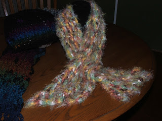 Second option, since I have recently picked up my crochet hook and am definitely "hooked" on it again... one of my favorite scarves... this one is made from very soft, very fuzzy multi-colored yarn in fall colors of oranges, browns, greens and creams.