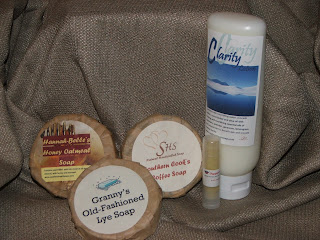 Third option, since I make my own all-natural soaps, lotions, and other bath and beauty products (www.southernheartsoaps.com)... a collection of some of my favorite products... three bars of soap... one honey oatmeal an all natural soap which contains real honey, real oatmeal, and is skin-loving and moisturizing... one Granny's Old-Fashioned Lye Soap which is exactly what it sounds like, a nostalgic tribute to days gone by, unscented, simple, moisturizing, and all natural... one Southern Cook's Coffee Soap... a soap made with real coffee and added coffee grounds that make a great exfoliant... coffee is odor absorbing so this soap is great for the kitchen to remove the odors of onions, fish, garlic, etc. from your hands (YES! it really works!)... also in this little set, I'm including a 6 ounce tube of Clarity Hand and Body Lotion made from avocado butter, cocoa butter, olive oil, with the essential oils of rosemary, lavender, geranium, lemongrass and peppermint which add skin-nourishing properties as well as mental clarity... and last but not least... a tube of peppermint lip balm made with honey, beeswax, olive oil and peppermint essential oil.