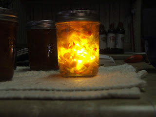 I ladled the mixture into the hot jars, leaving a 1/4 inch head space. I wiped the rims and tightened the lids on to fingertip tightness.