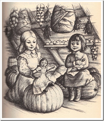 ...The attic was a lovely place to play. The large, round, colored pumpkins made beautiful chairs and tables. The red peppers and the onions dangled overhead. The hams and the venison hung in their paper wrappings, and all the bunches of dried herbs, the spicy herbs for cooking and the bitter herbs for medicine, gave the place a dusty spicy smell.