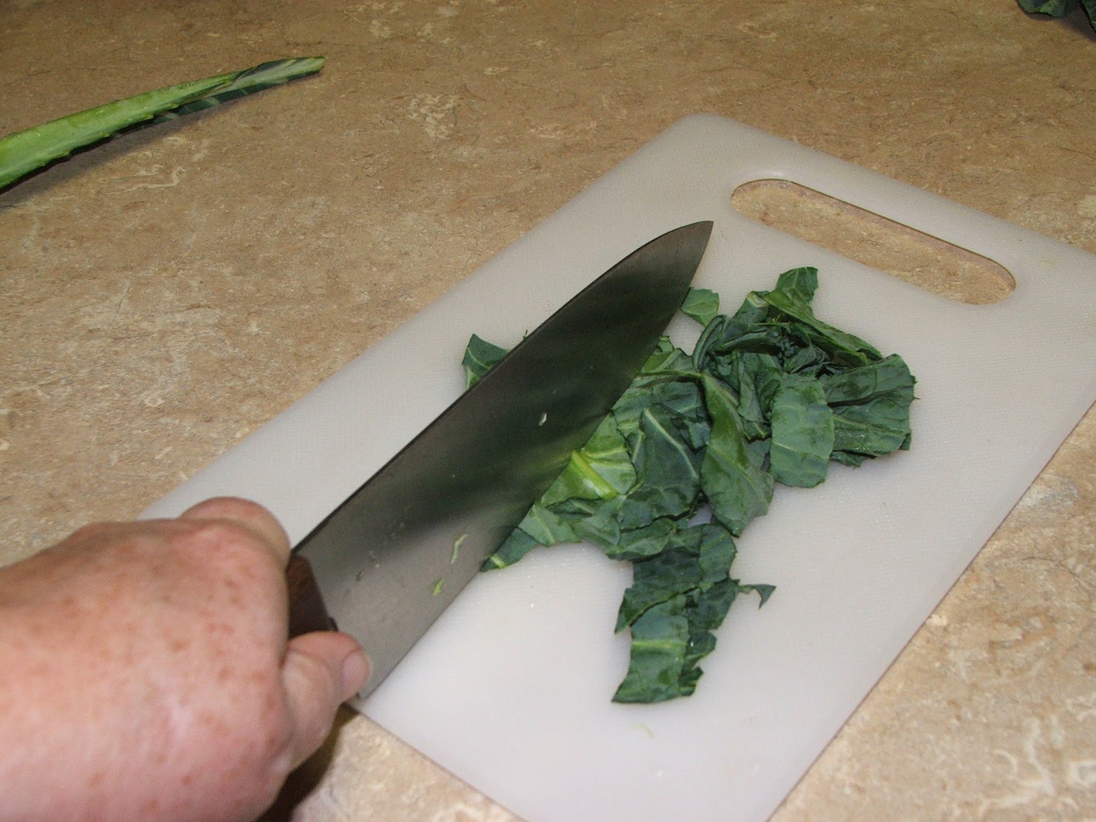 ... I began chopping the collards... I removed the tough stems (the compost pile is gonna LOVE these... if you have chickens, pigs, goats, or rabbits, they'd love the New Year treat as well)