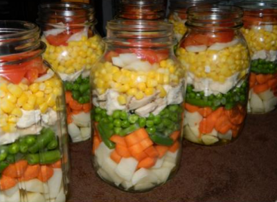 I do sterilize the jars then let them cool down so they are not too hot to handle bare handed. I filled 7 qt jars with all these measured ingredients doing cabbage last …. Topping off each qt with packing the cabbage on the top. Then I ladled the broth mixture to 1 inch head space. I prefer to cold pack when canning… so I can control the ingredients into each jar, and I can plan a full canner. To ladle from a pot of all ingredients you may get more or less of some items into the jars. You will end up having too much ingredients… throw into a pot cook it up and you have tonight’s dinner and a full canner being processed. Put the seals and rings on the jars to finger tight and into a cold pressure canner. Bring to a steam for 10 minutes then process like you would for beans (same as meats) in your area. Again, I cold pack can to control the ingredients into each jar… and to me it’s much easier.