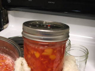 After processing, I removed the jars of relish using my jar lifter and set them on a folded dish towel on the counter to cool... and to listen for the PING of each successfully sealed jar.