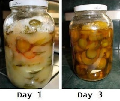 Drain and slice pickles into 3/8 inch slices. Layer ingredients in gallon pickle jar. Let stand 3 – 4 days. Shake once a day. The pickles will make their own juice. Refrigerate.