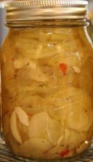 4. In a large saucepan, bring the cucumber mixture to a temperature of 180° F and turn off the heat, keep covered. Have eight (8) 1-pint jars heated and then pack them with a ¼-inch head space with the cucumbers, onions, garlic, and liquid. If you are making a ½ batch of the spicy cucumbers, then 4 jars will be for them and the other 4 for the regular cucumbers. Use a rubber spatula to remove any trapped air bubbles by scraping the inside edge of the jar and the food mixture. Wipe the jars well and seal with the lids and screw bands, tighten the bands an extra ¼ turn after they start to seal well. Process in a water-bath covered with at least 1 to 2 inches of water for 10 minutes at 212° F. Turn off the heat and allow the jars to sit for 5 minutes, then remove the jars from the canner and allow the jars to cool on a kitchen towel for 12 to 24 hours. Label, date, and store them in a cool, dry, dark location for 6 weeks before serving. Refrigerate any open jars and consume them within two weeks of opening.