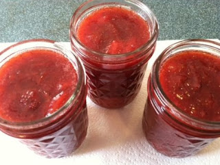 Using sterilized jars ladle the recipe into 4 half pint jars, remove air bubbles and refill to 1/4" headspace. Using a wet paper towel clean rims, add heated lids and add rings.