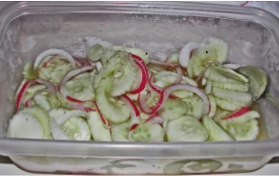 Peel the cucumbers and slice thinly. Slice onions if using and put all in a small bowl.